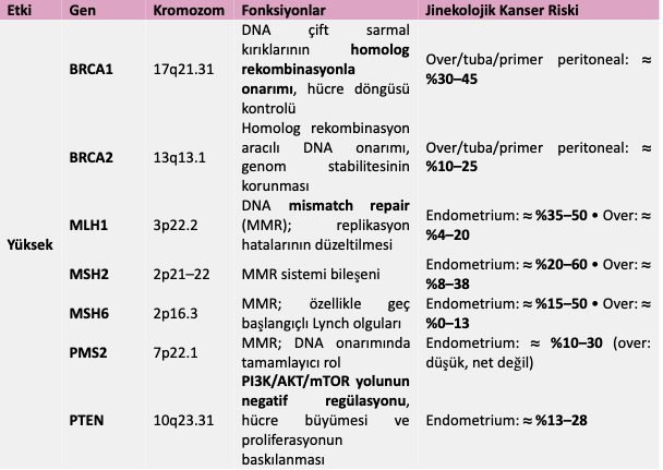• Lynch sendromu genleri (MLH1, MSH2, MSH6, PMS2, EPCAM): Endometrium ve bazı over kanserlerinde belirgin risk artışı; MSI-yüksek/dMMR fenotipi ile immünoterapiye duyarlılık gösterebilir.