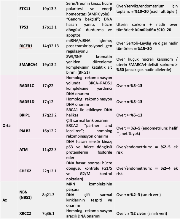• BRCA1/BRCA2, RAD51C/D, BRIP1, PALB2: Özellikle yüksek dereceli seröz over/tuba/primer peritoneal kanser için yaşam boyu riski artırır; bu hastalar PARP inhibitörü tedavisinden anlamlı fayda görebilir.