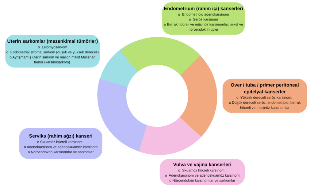 Dünya Sağlık Örgütü sınıflamasına göre jinekolojik kanserlerin büyük kısmı epitelyal tümörlerdir; bunların önemli bölümü endometrium ve over kaynaklıdır. Daha nadir gruplar arasında germ hücreli tümörler, seks kord–stromal tümörler ve uterin sarkomlar yer alır. Histolojik alt tip, hem hastalığın gidişatını hem de tedavi yaklaşımını belirleyen temel faktörlerden biridir. 2, 6, 8, 9, 10